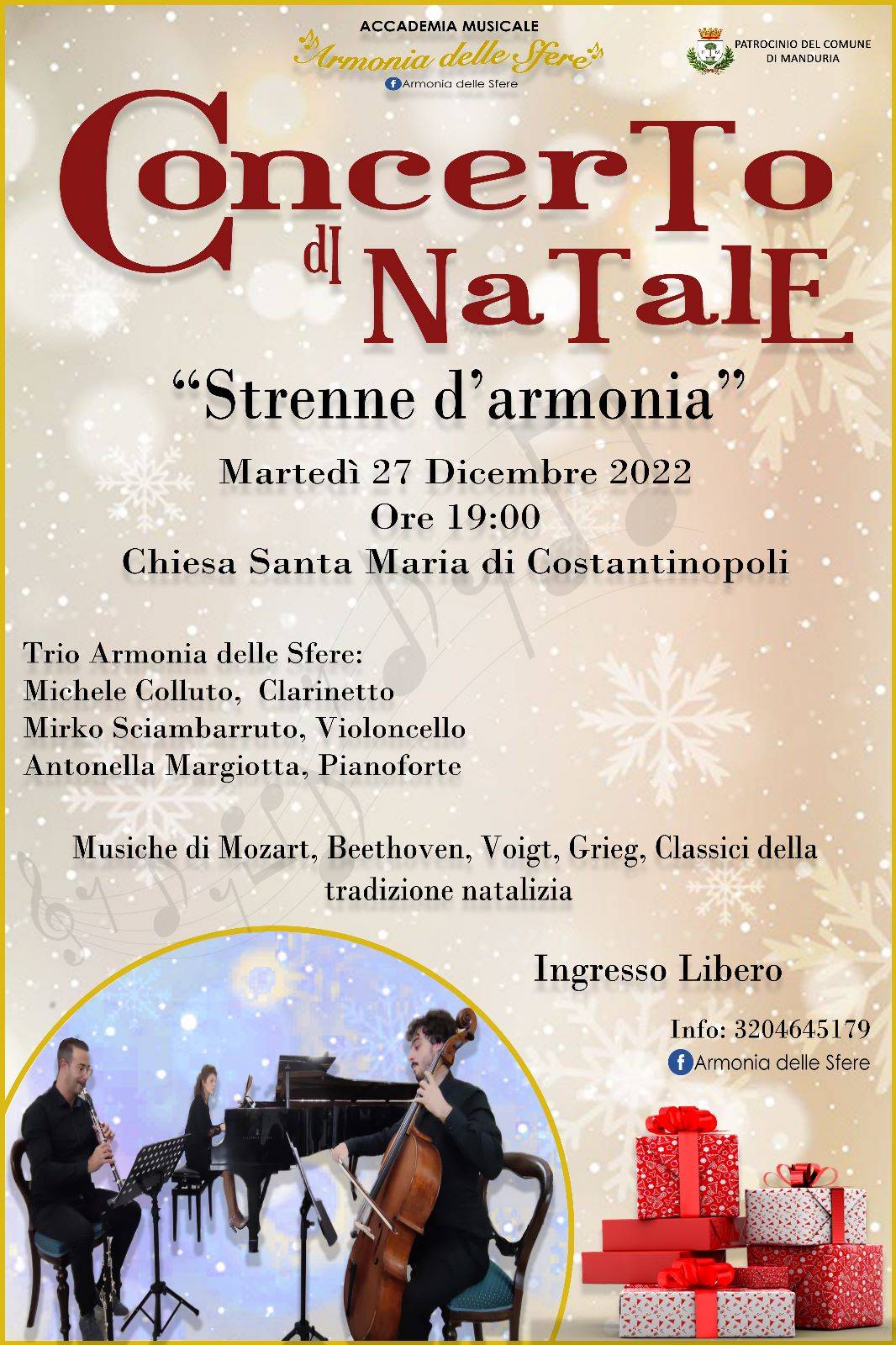 L’accademia Armonia delle Sfere conclude il 2022 con un concerto natalizio da camera “Strenne d’armonia”, che avrà luogo nella chiesa di Santa Maria di Costantinopoli martedì 27 dicembre, alle ore 19.