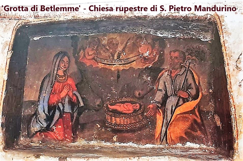 Le immagini che accompagnano lo scritto sono tratte dal volume presentato, fatta eccezione per la prima, che riproduce il dipinto presente nella chiesa rupestre di San Pietro Mandurino. Da ‘Manduria Sacra’ del Tarentini si evince che esso fu restaurato nel 1724, all’epoca della visita dell’arcivescovo Giovanni Battista Labanchi; in ‘Manduria e manduriani’, G. Arnò la menziona come ‘La grotta di Betlemme’, in riferimento alla singolare collocazione della pittura in uno dei vani esistenti, a mo’ di edicole, nelle varie cripte.