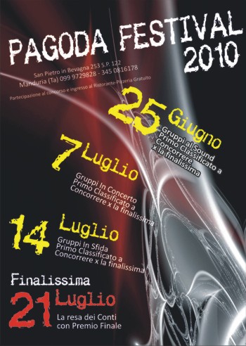 a tutti coloro che hanno talento, e voglia di fare buona musica...L’evento si chiama Festival Pagoda. Sono state fissate già 4 date, tra giugno e luglio! Nelle prime tre si concorre per arrivare alla finalissima, alla quale si qualificano i vincitori delle prime tre serate.
