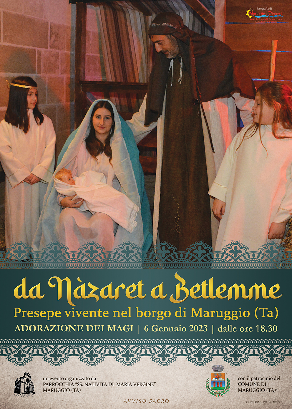 Nel suggestivo scenario del centro storico di Maruggio, il 6 gennaio, a partire dalle 18.30, è possibile visitare il presepe vivente concepito per quadri narrativi che rappresentano le più celebri scene dei Vangeli sinottici.