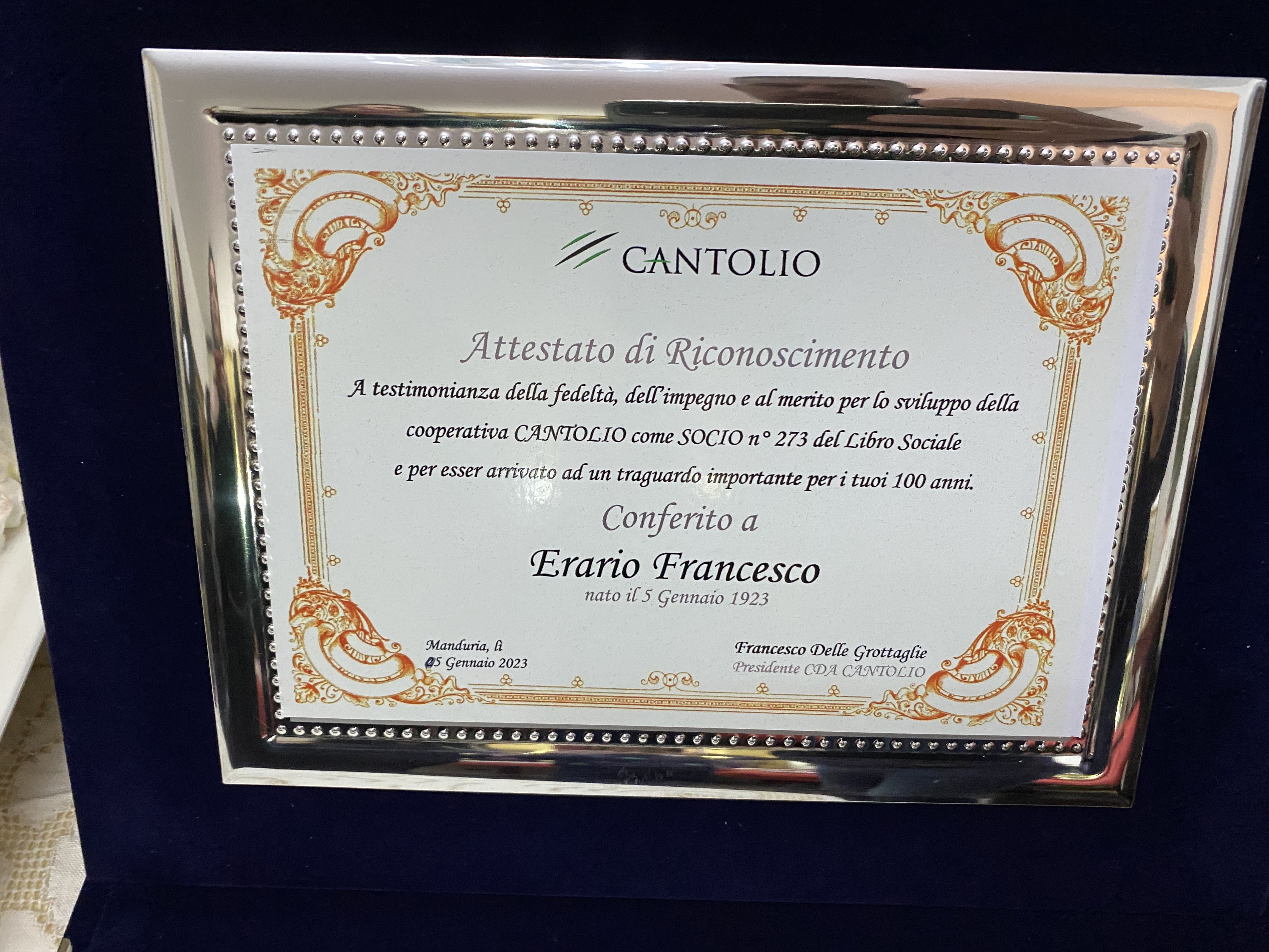 Con gioia e riconoscenza hanno preso parte all’evento anche il presidente della cantina Cantolio Francesco Delle Grottaglie e il ragioniere Antonio Calò, che hanno consegnato al signor Erario una targa ricordo: il nuovo centario di Manduria è il 273° socio del Libro Sociale, a testimonianza della fedeltà, dell'impegno e al merito per lo sviluppo della cantina.