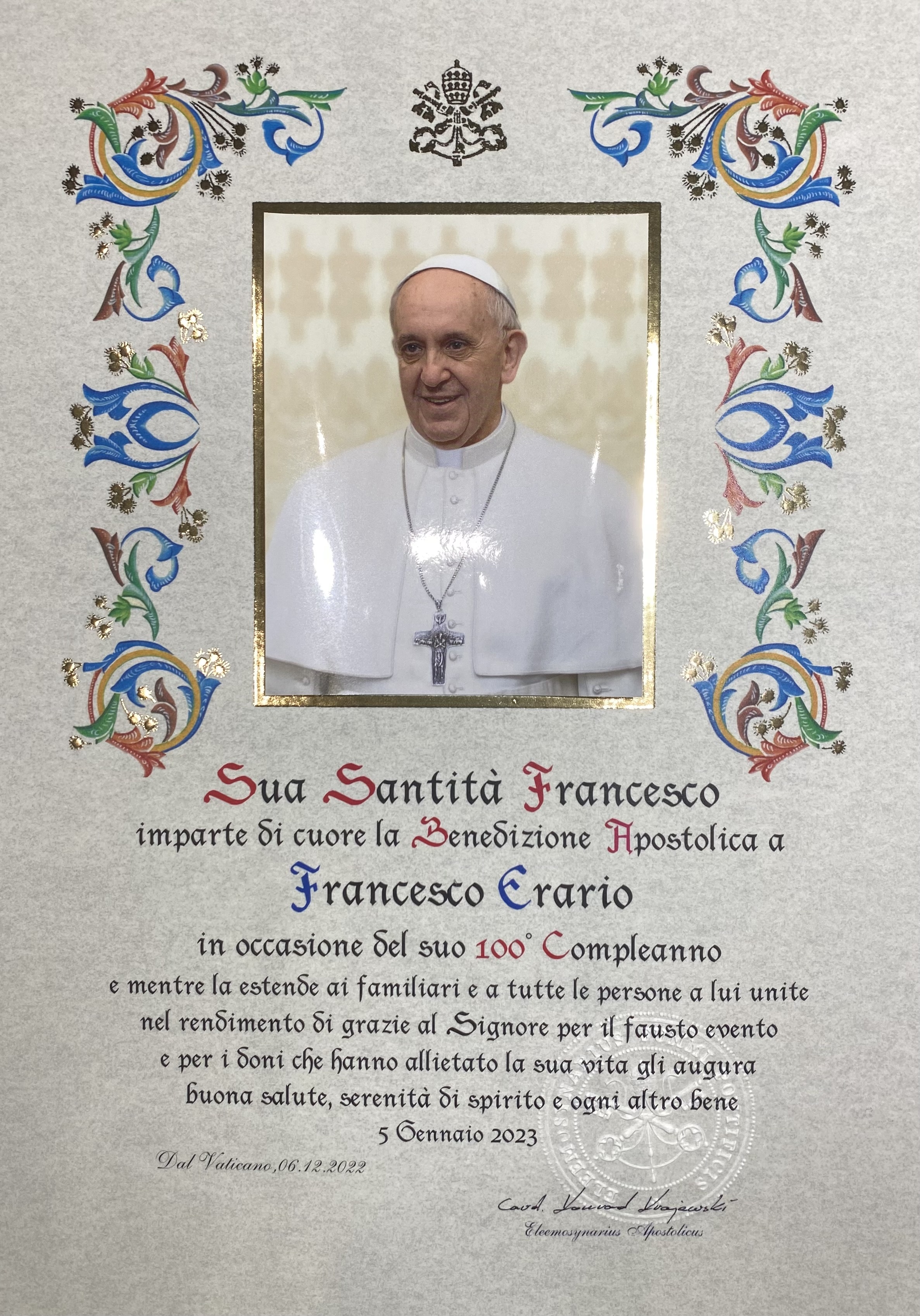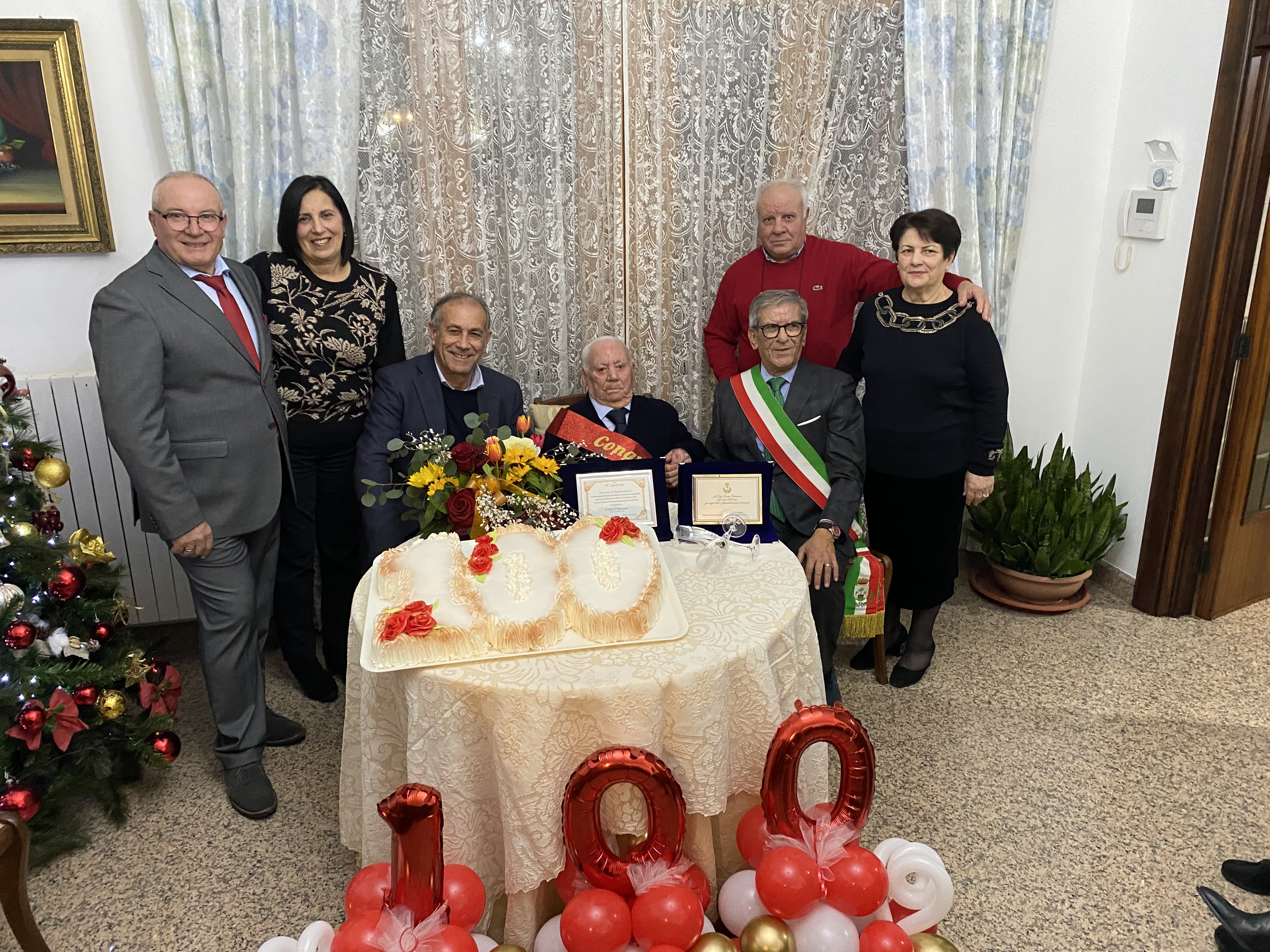 Attorniato da tutta la sua famiglia, il signor Francesco ha ricevuto anche gli auguri dai rappresentanti dell’Amministrazione, dal parroco don Pasquale Dellomonaco (che ha benedetto il festeggiato per il dono della lunga vita consegnando la Benedizione Apostolica del Papa), e dall’amico di famiglia Mario Doria.