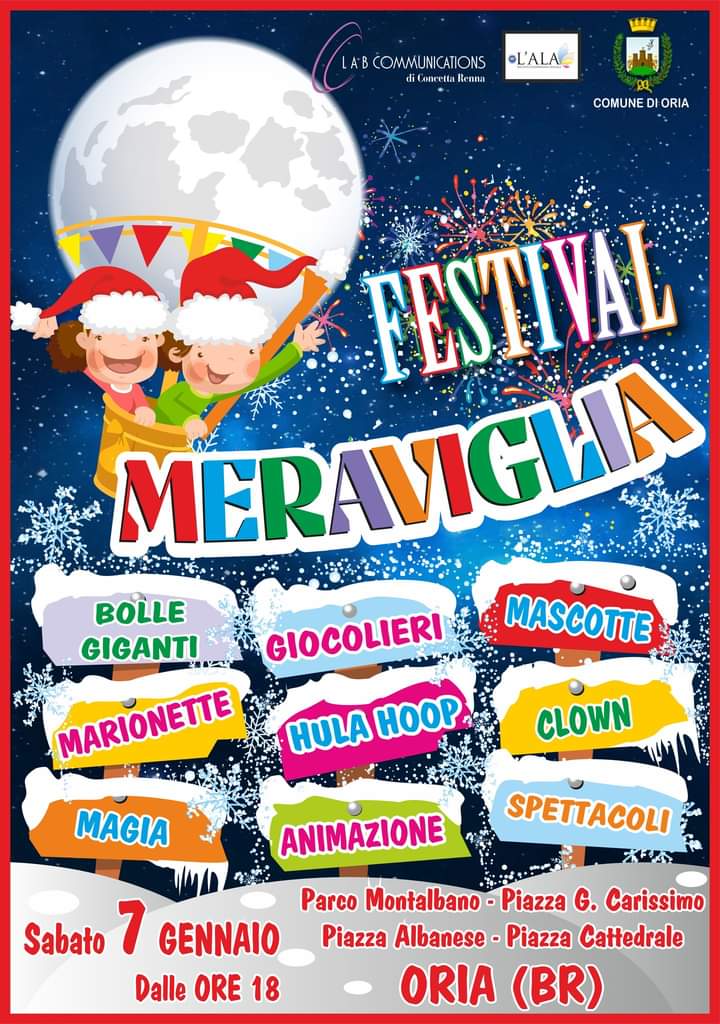 Questa sera ad Oria arriva il Festival Meraviglia, un pomeriggio dedicato all'allegria e intrattenimento per i più piccoli, con spettacoli ed attrazioni dislocati in piazza G. Carissimo, piazza Albanese, piazza Cattedrale e parco Montalbano.