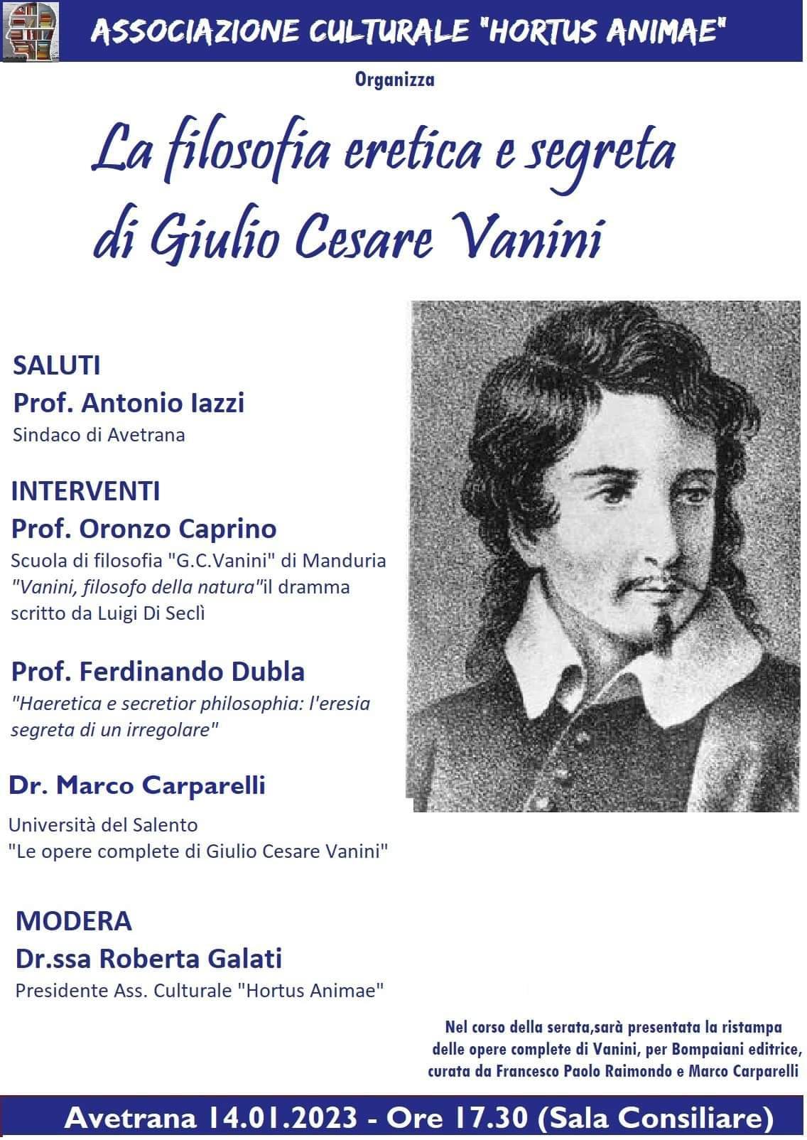 Interverranno per la scuola di filosofia “G. C. Vanini” di Manduria Oronzo Caprino (“Vanini, filosofo libertino e della natura - il dramma scritto da Luigi Di Seclì”), Ferdinando Dubla (“Haeretica e secretior philosophia: l’eresia segreta di un irregolare”).