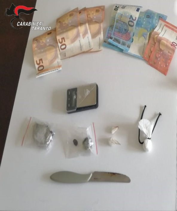 Una accurata perquisizione domiciliare nelle rispettive abitazioni, ha permesso di rinvenire e sequestrare sostanze stupefacenti di vario tipo, in grado di soddisfare ogni esigenza: 10 grammi del tipo cocaina, 125 grammi del tipo hashish; oltre 800 euro in banconote di vario taglio presumibilmente frutto dell’attività di spaccio, nonchè materiale idoneo per confezionare le dosi dello stupefacente, già inviato al Laboratorio di Analisi Sostanze Stupefacente del Comando Provinciale Carabinieri di Taranto per le opportune analisi di competenza.
