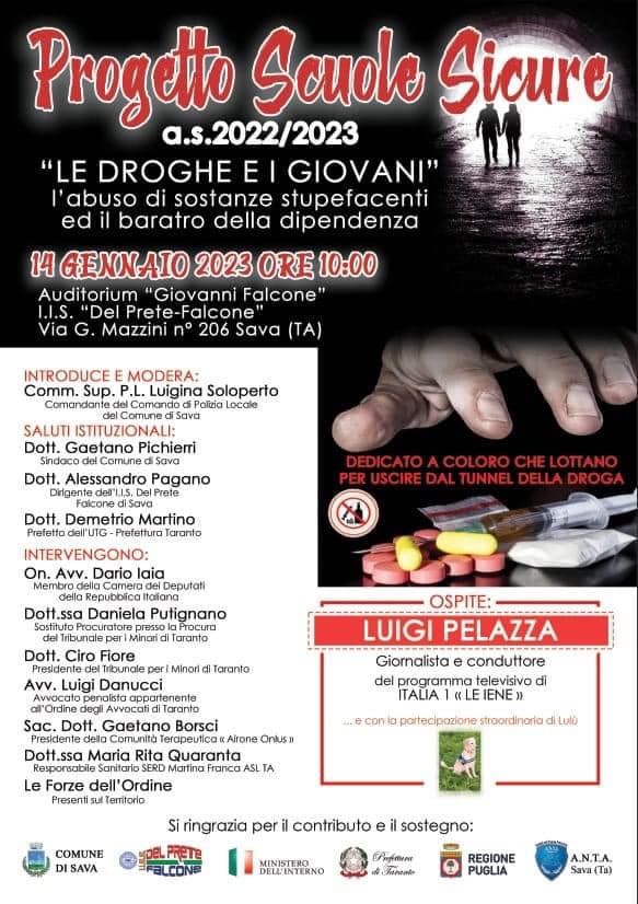 «Il fenomeno droga viene spesso dimenticato e l’obiettivo è quello di riaccendere i riflettori su questo annoso problema della nostra società» è scritto in una nota del Comune di Sava. «A tal fine, abbiamo promosso questo incontro per parlare direttamente ai giovani degli effetti derivanti dall'uso di sostanze stupefacenti e della loro pericolosità. Il convegno rientra nel progetto “Scuole Sicure”, con il quale è stata prevista altresì l’implementazione del sistema di videosorveglianza nei pressi dell'I.I.S. "Del Prete-Falcone", nonché una maggiore presenza della Polizia Locale, in collaborazione con le forze dell’ordine, al fine di creare un effetto deterrente ed attuare un’azione di monitoraggio».