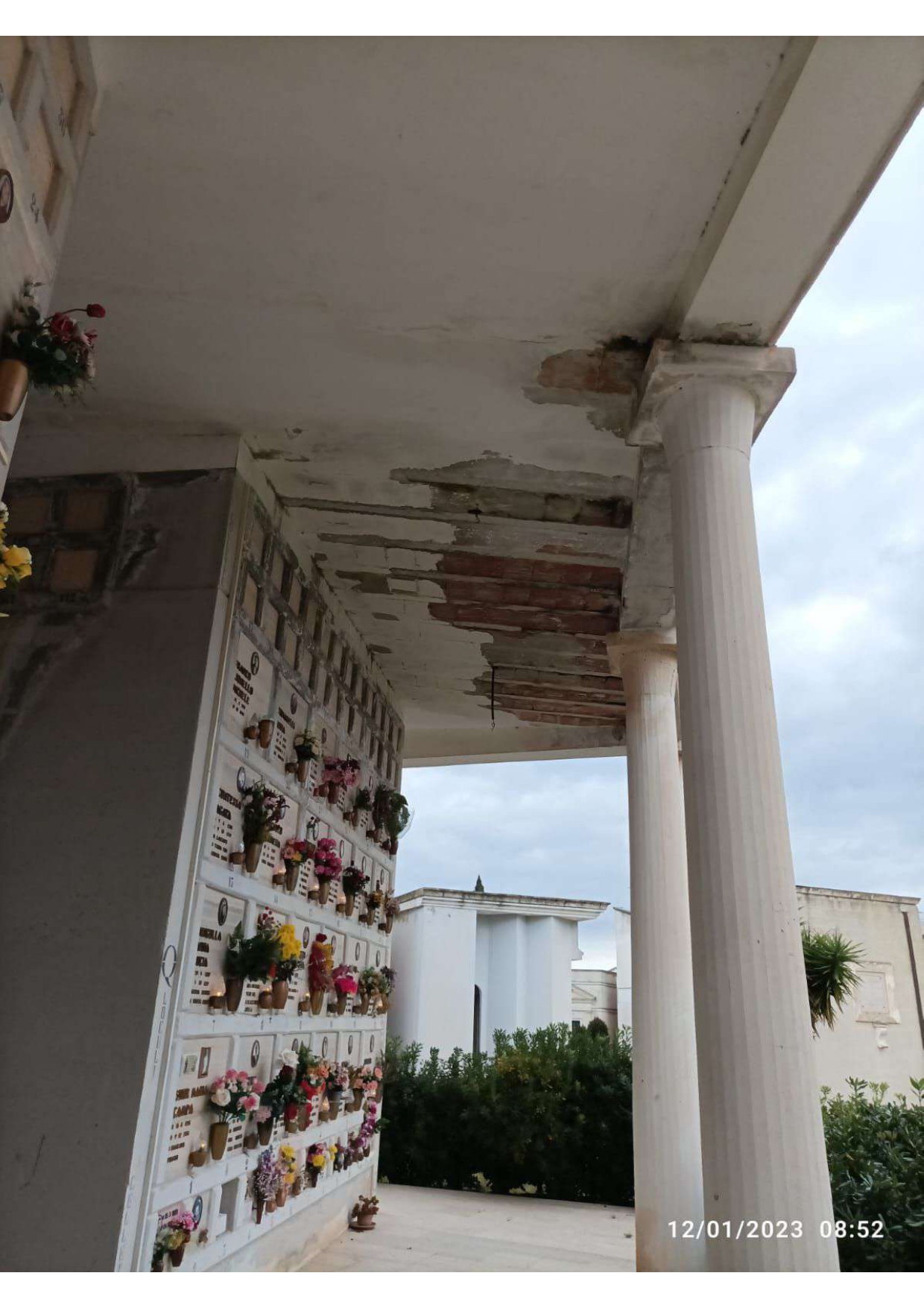 Il cimitero, luogo di culto, preghiera ed emozioni, di sommesse parole pronunciate ad una foto che schiarisce nel tempo, appare oggi fatiscente e desolante in ogni suo aspetto. In verità sussiste un considerevole disordine ambientale: si manifesta con vistose pozzanghere d’acqua che non permettono la viabilità pedonale, con centraline elettriche a cielo aperto, cassonetti di raccolta dei rifiuti rotti in ogni parte, un vecchio muro di recinzione pericolante che costeggia le cappelle private, ammassi incustoditi di materiali di scarto edilizio. Lo stato di degrado viene ancora messo più in evidenza dalla presenza di erbe infestanti in ogni luogo, segno di inadempienza delle periodiche attività di pulizia delle aiuole e dei vialetti. Sono state notate anche numerose lapidi completamente spaccate o adagiate a terra nel luogo di sepoltura dei cari defunti, che allo stato non appaiono dignitose per il riposo eterno.