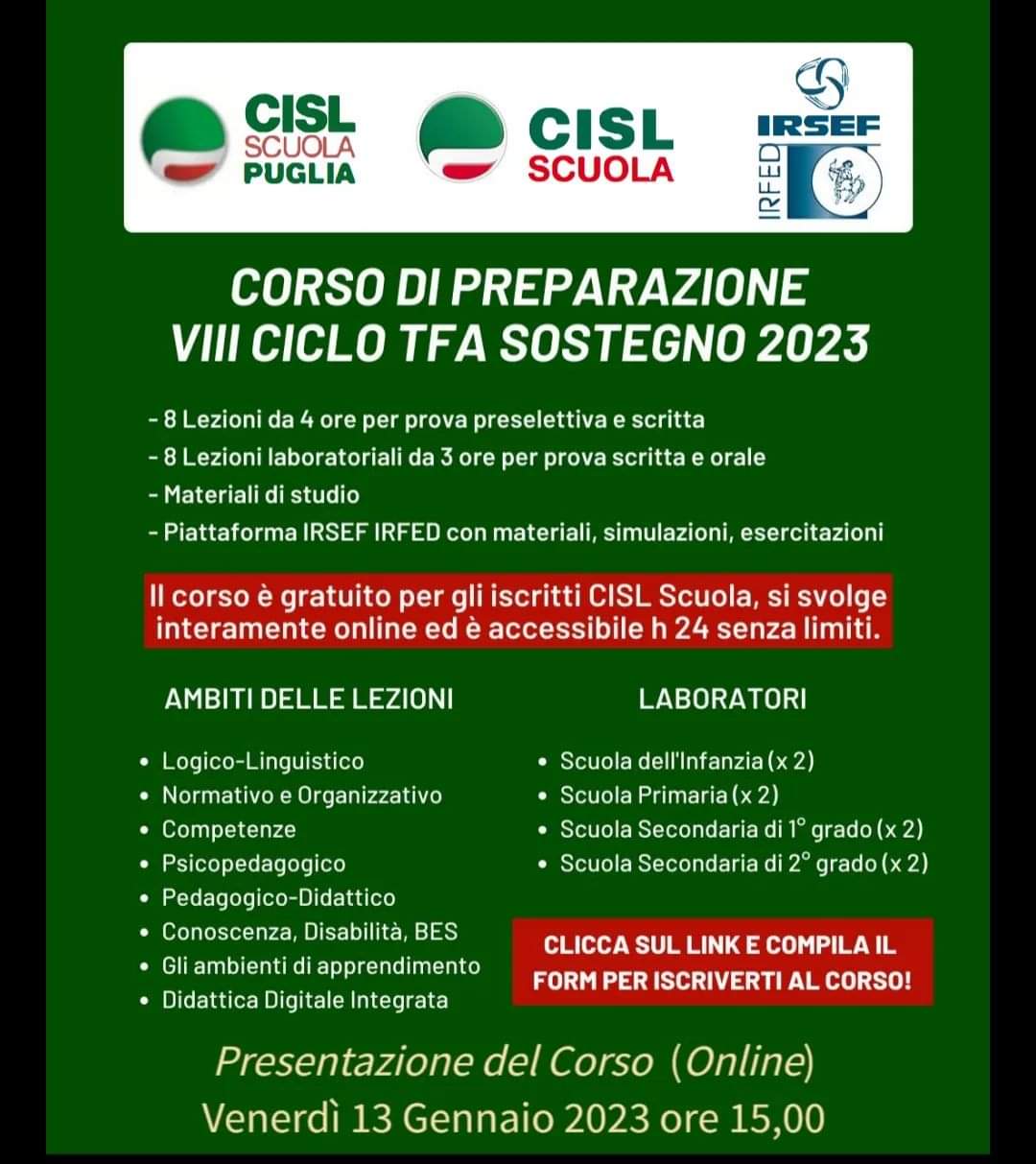 Cisl Scuola, con la collaborazione della Cisl Scuola Puglia e Irsef Irfed, ha organizzato il Corso di Preparazione VIII Ciclo TFA Sostegno 2023.