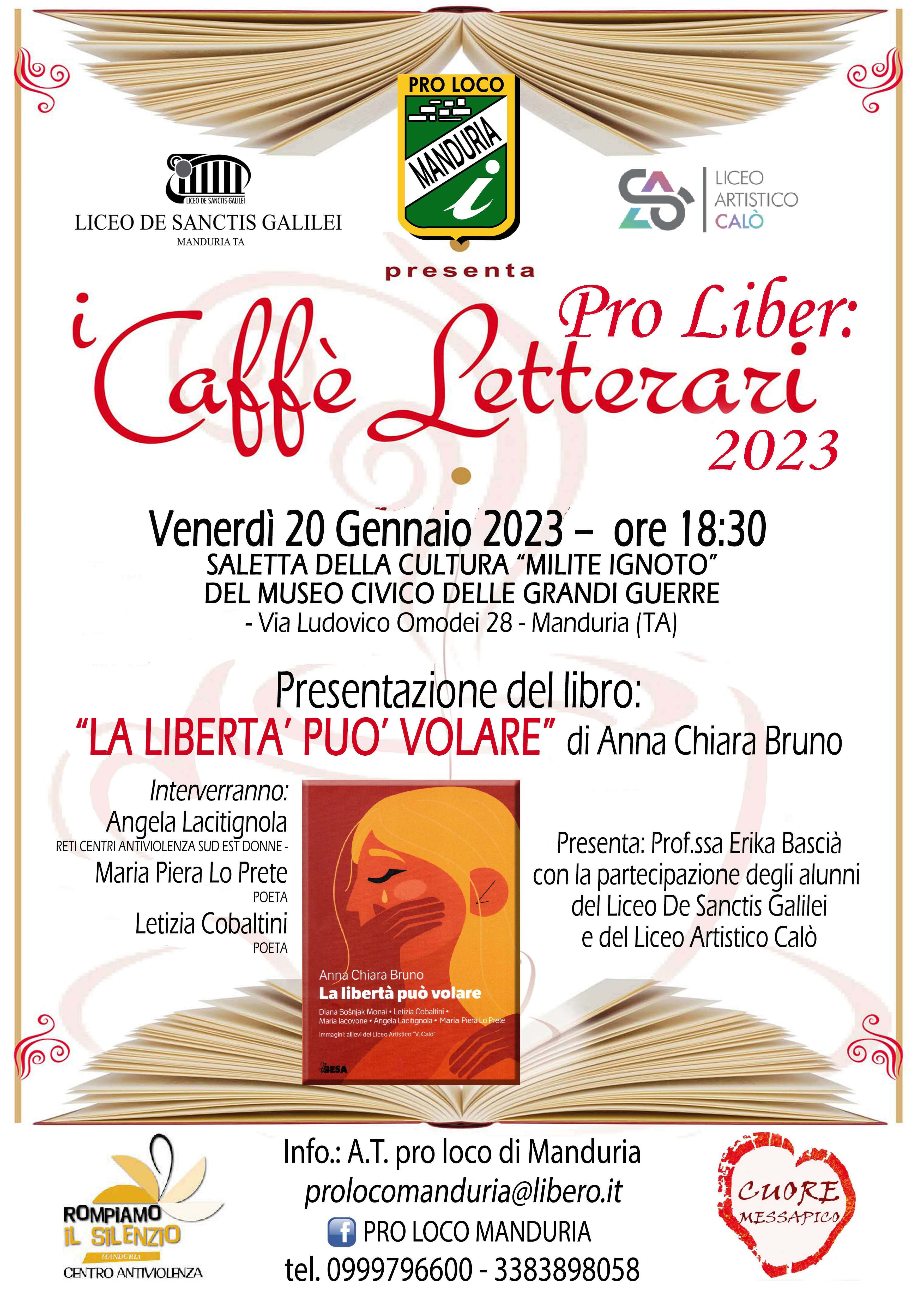 Nuovo appuntamento con il Pro Liber: i caffè letterari della Pro Loco di Manduria con “La libertà può volare”, l’ultima opera di Anna Chiara Bruno.