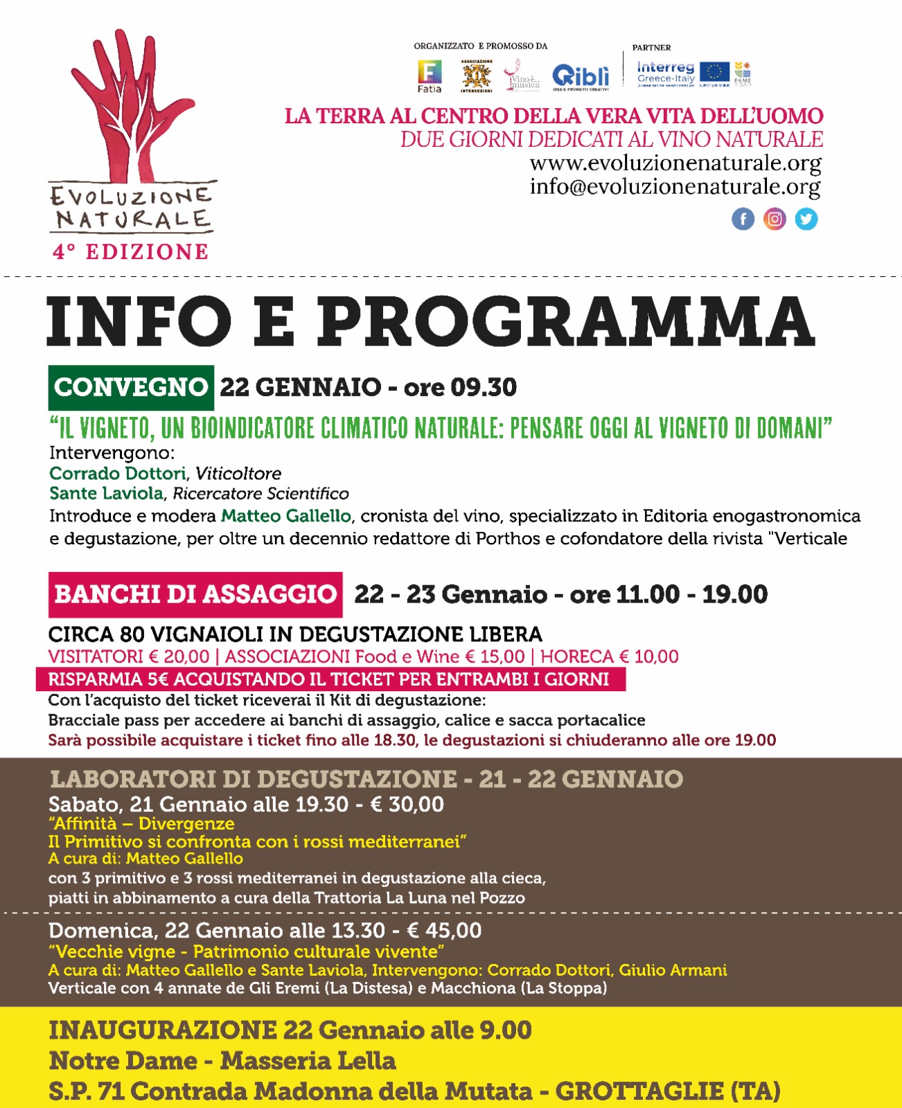 Evoluzione Naturale è la fiera pugliese rivolta ai professionisti e al grande pubblico. Il ticket comprende il kit di degustazione: pass bracciale per la degustazione libera ai banchi di assaggio, calice e sacca porta calice. Il ticket non comprende l’accesso ai laboratori di degustazione. I banchi di assaggio saranno aperti: domenica 22 gennaio dalle ore 12 alle ore 19 e lunedì 23 gennaio dalle ore 10 alle ore 19.