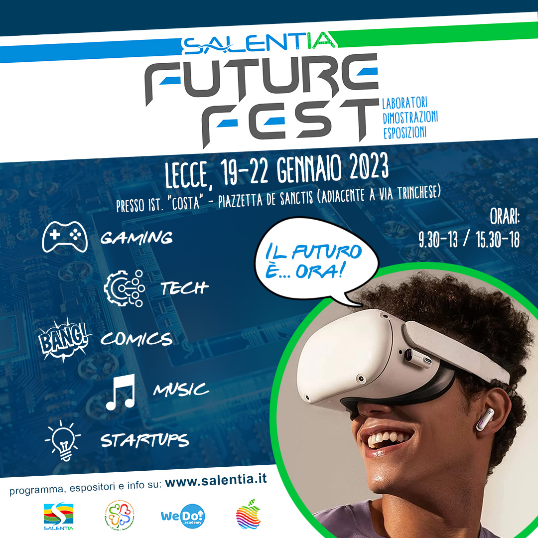 Il Salentia Future Fest è la prima edizione del salone dell’innovazione, della tecnologia, del futuro e delle startup. È promosso e organizzato dai giovani ed è rivolto ai giovani. Intende offrire uno spazio fisico e applicativo a tutti quei “mondi” a cui i giovani sono particolarmente legati, come il gaming, le nuove tecnologie, la musica, i comics, la formazione e le startup.