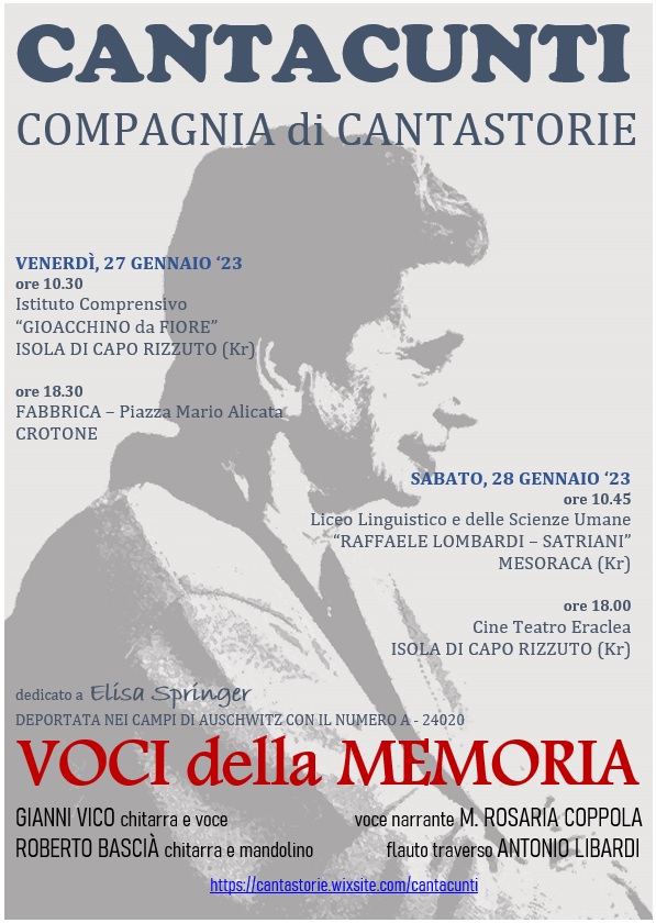 Con queste parole i Cantacunti, compagnia di cantastorie di Manduria, annunciano 4 appuntamenti (tutti in Calabria) in occasione del 27 gennaio, Giornata della commemorazione della Shoah.