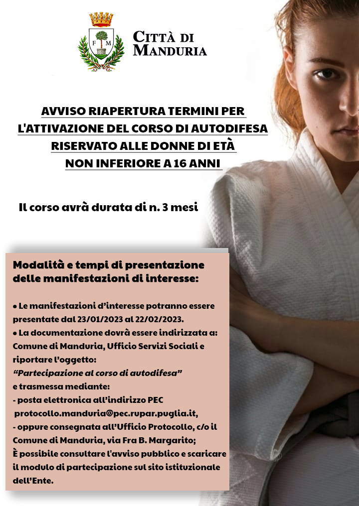 L'avviso pubblico è rivolto alla popolazione femminile ed il corso si svolgerà presso l’associazione sportiva dilettantistica Zen Club - con sede in via Senio s.n.c. a Manduria.