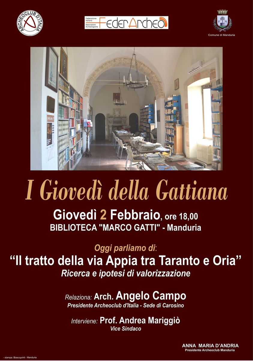 Giovedì 2 febbraio, alle ore 18, nella sala di lettura della biblioteca civica, nell’ambito degli ormai tradizionali “Giovedì della Gattiana” organizzati da Archeoclub, l’architetto Angelo Campo, presidente della sede di Archeoclub d’Italia di Carosino e dei territori del Mesochorum, relazionerà su “ Il tratto della via Appia tra Taranto ed Oria tra ricerca ed ipotesi di valorizzazione”.