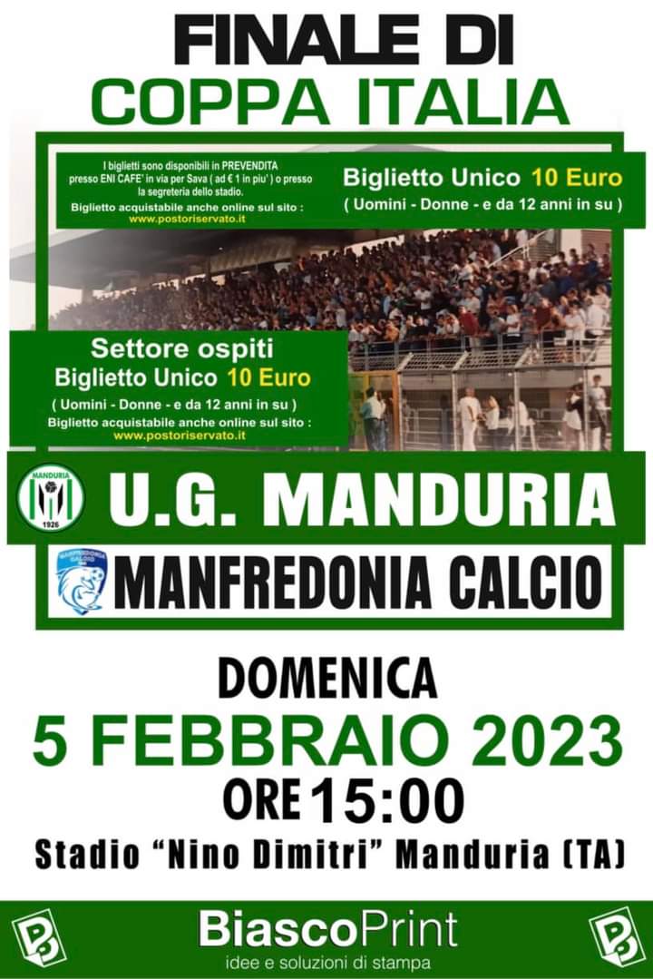 La finale di ritorno della 56ª edizione della Coppa Italia Dilettanti di Eccellenza (fase regionale) tra U. G. MANDURIA SPORT e MANFREDONIA CALCIO 1932 avrà luogo domenica 5 febbraio 2023 presso lo Stadio Comunale “Nino Dimitri” di Manduria con fischio d’inizio alle ore 15. Il match sarà diretto da Andrea CIANCI della sezione di Bari, coadiuvato dagli assistenti Piergiacomo PALERMO (Bari) e Gabriele LOVECCHIO (Brindisi); quarto ufficiale di gara Marco COLAZZO della sezione di Casarano.