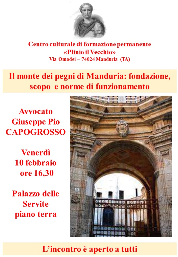 Il 10 febbraio l’avv. Giuseppe Pio Capogrosso parlerà sul tema, inedito: “Il monte dei pegni di Manduria: scopo e norme di funzionamento”.