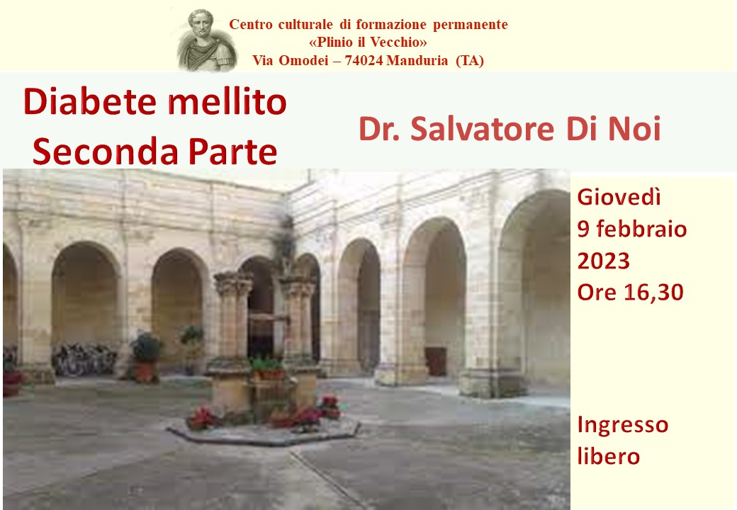 Giovedì 9 febbraio il dr. Salvatore Di Noi tratterà la parte seconda dell’argomento del diabete mellito. Nella prima parte, tenuta il 2 febbraio, il dr. Di Noi ha parlato della grossa piaga che affligge l’umanità: il diabete. Ha detto che la popolazione mondiale affetta da diabete, supera i 650 milioni, una vera e propria “pandemia”.
