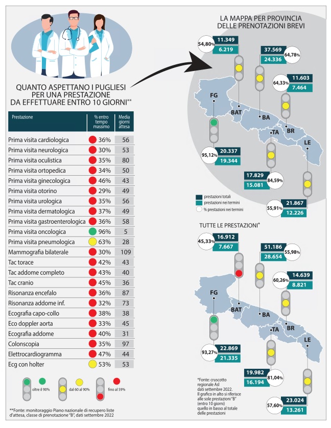 Nel resto della Puglia la situazione non è migliore. Anzi, stando ai dati diffusi dalla Regione e relativi allo scorso mese di settembre, nella provincia di Foggia la situazione, per quel che riguarda le liste di attesa, è addirittura peggiore rispetto a quella della provincia di Taranto (nell’immagine, il quadro della situazione in Puglia).