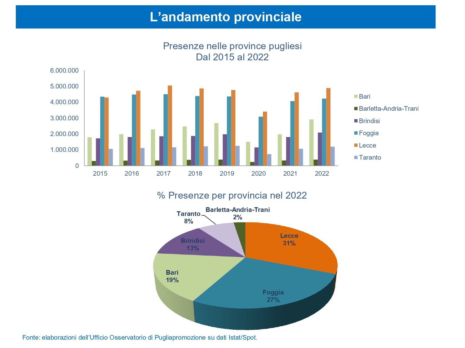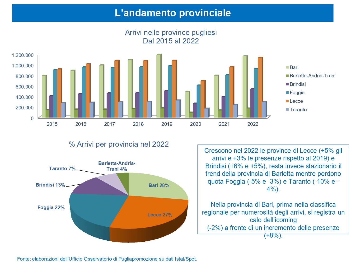 L’andamento provinciale rispetto al 2019 evidenzia crescite per le province di Lecce e Brindisi mentre calano Foggia e Taranto. Bari è la prima provincia per numero di arrivi e terza per presenze turistiche;