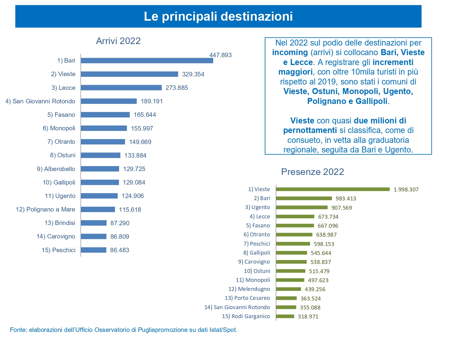 Nel 2021 (ultimo dato annuale disponibile) la Puglia si classifica prima regione del Sud d’Italia per incoming (arrivi turistici) superando Sicilia e Campania e posizionandosi al nono posto anziché al dodicesimo come nel 2019 e nel 2015;