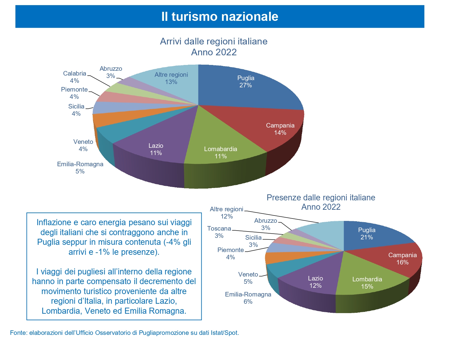 Un’economia solida e tuttavia in espansione; il bilancio del 2022 si conclude con risultati evidenti. La Puglia ha recuperato i valori del 2019 e chiude l’anno con oltre 4,2 milioni di arrivi, il numero di turisti, e 15,7 milioni di presenze, le notti trascorse nella ricettività regionale, con un andamento rispetto al 2019 stazionario per gli arrivi (-0,5%) e positivo per le presenze (+2%).