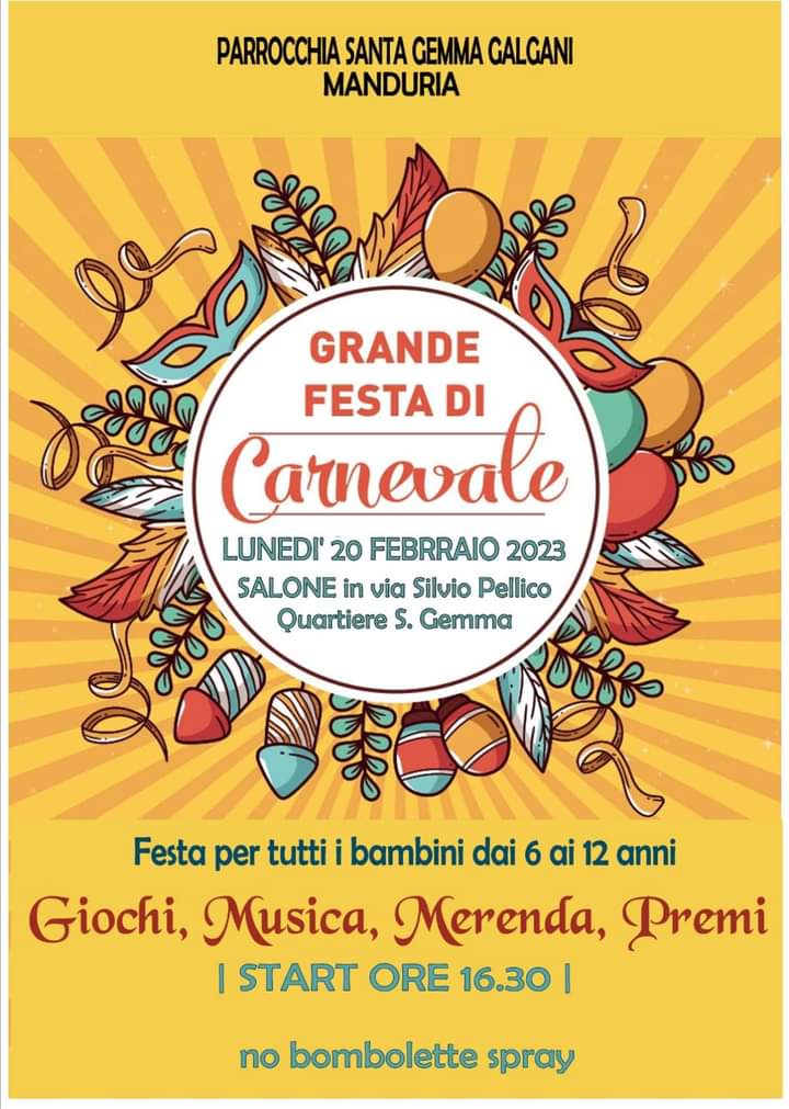 Una grande festa di Carnevale organizzata dalla parrocchia Santa Gemma Galgani. Si svolgerà lunedì prossimo, 20 gennaio, nel salone di via Silvio Pellico, nel quartiere Santa Gemma ed è riservata a tutti i bambini dai 6 ai 12 anni. In programma giochi, musica, merenda e premi