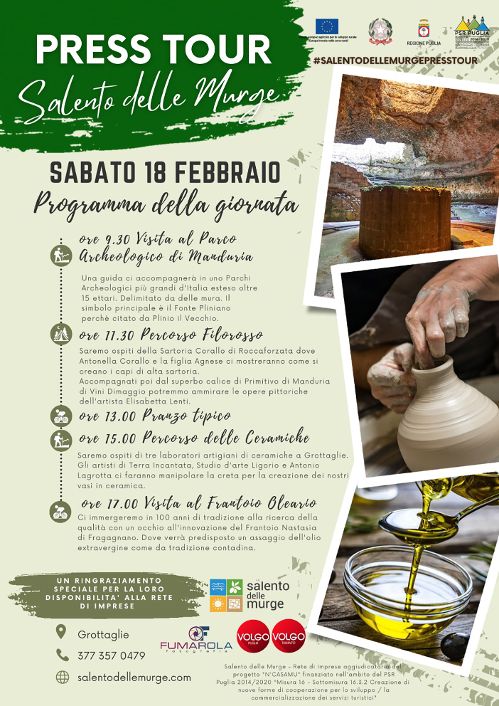 Nella giornata di sabato 18 febbraio si terrà il Press tour del network Salento delle Murge che vedrà giornalisti, blogger ed esperti di comunicazione visitare realtà di quattro comuni le cui Amministrazioni hanno patrocinato l’evento: Manduria, Roccaforzata, Grottaglie e Fragagnano (info 3773570479)