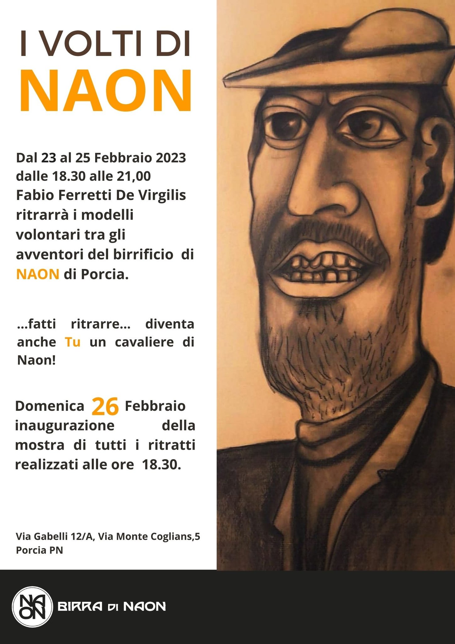 I volti di Naon: altra iniziativa artistica di Fabio Ferretti dei Virgilis. Dal 23 al 25 febbraio, a Porcia, in Friuli, ritrarrà i modelli volontari tra gli avventori di un birrificio. Il 26 ci sarà la mostra dei lavori realizzati.