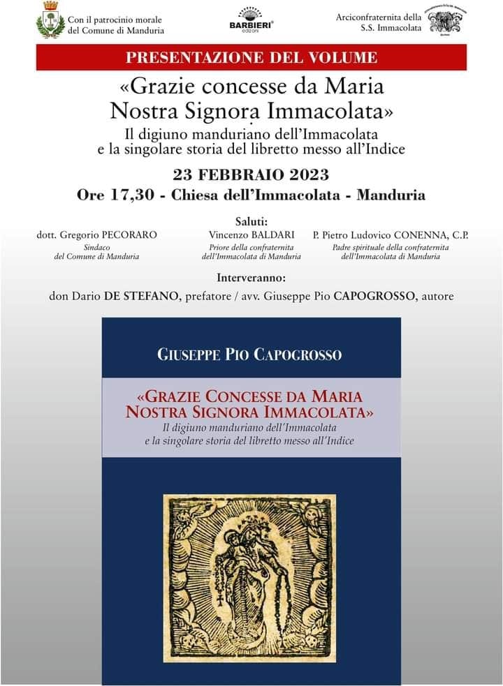 Giovedì 23 febbraio, alle ore 17,30, sarà presentato nella chiesa dell’Immacolata di Manduria il volume dal titolo “Grazie concesse da Maria Nostra Signora Immacolata – Il digiuno manduriano dell’Immacolata e la singolare storia del libretto messo all’Indice” scritto dall’avv. Giuseppe Pio Capogrosso per i tipi dell’editore Barbieri.