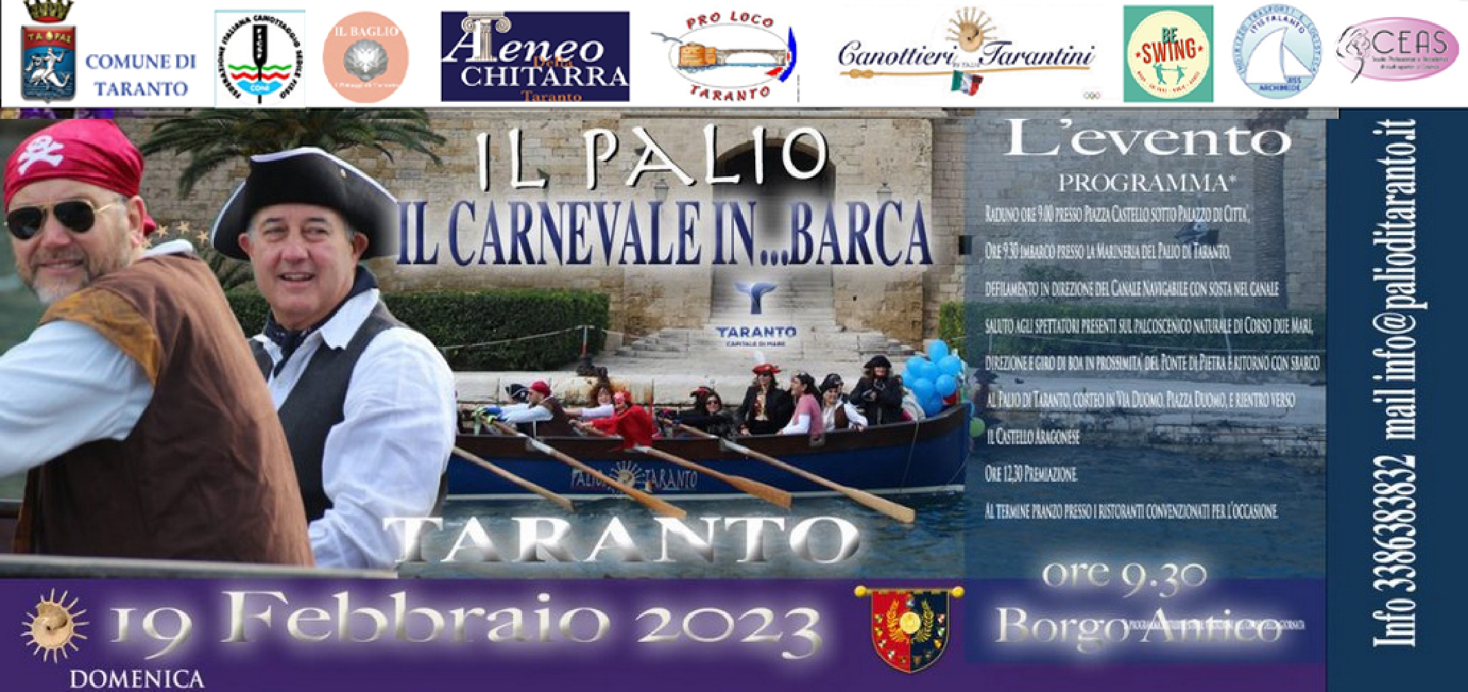 Con il patrocinio del Comune di Taranto e della Federazione Italiana Canottaggio Sedile Fisso. E’ prevista la premiazione dell’equipaggio partecipante più numeroso, dell’equipaggio più spettacolare e in assoluto la maschera più bella.
