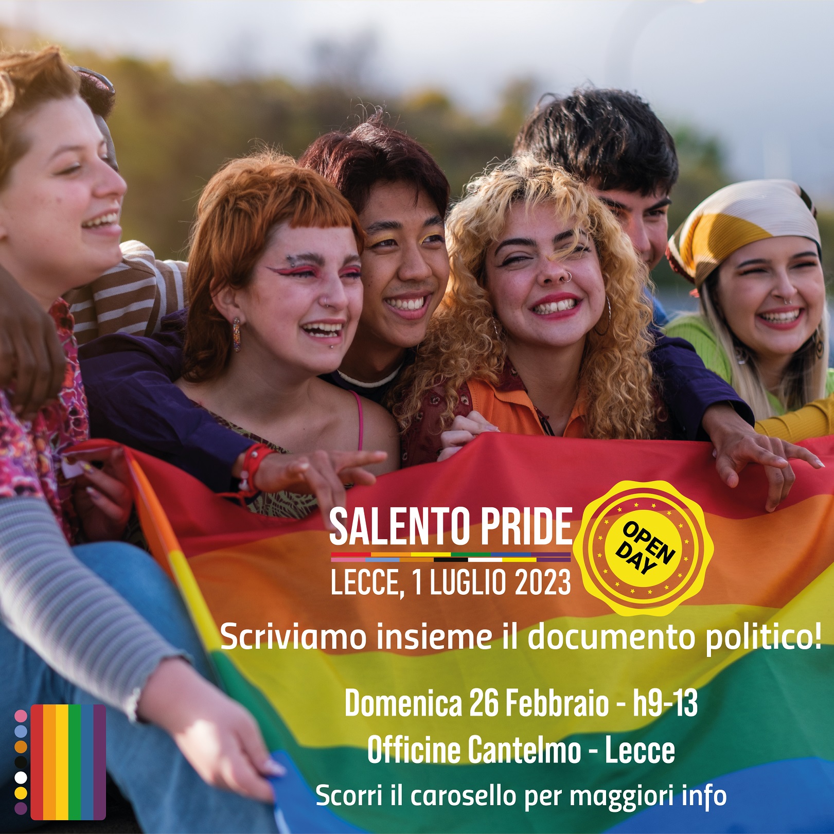 Su iniziativa del Coordinamento Rivendicativo Politico, domenica 26 febbraio, dalle ore 9 alle ore 13, le officine Cantelmo ospiteranno il primo open day al fine di aderire al Salento Pride: sarà redatto il Documento Rivendicativo Politico.