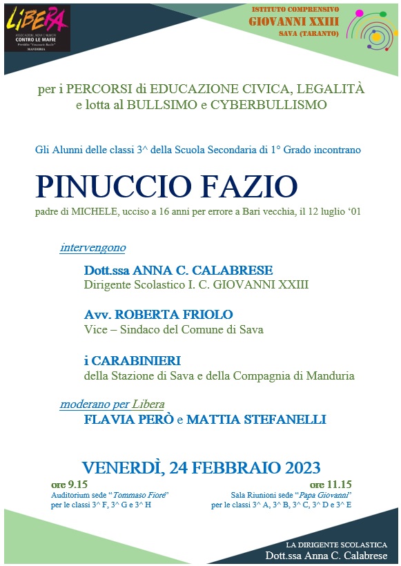Nella giornata di venerdì, 24 febbraio, l’istituto comprensivo “Giovanni XXIII” di Sava ospiterà Pinuccio Fazio, padre di Micheke, ucciso a 16 anni per errore a Bari vecchia, il 12 luglio 2001.