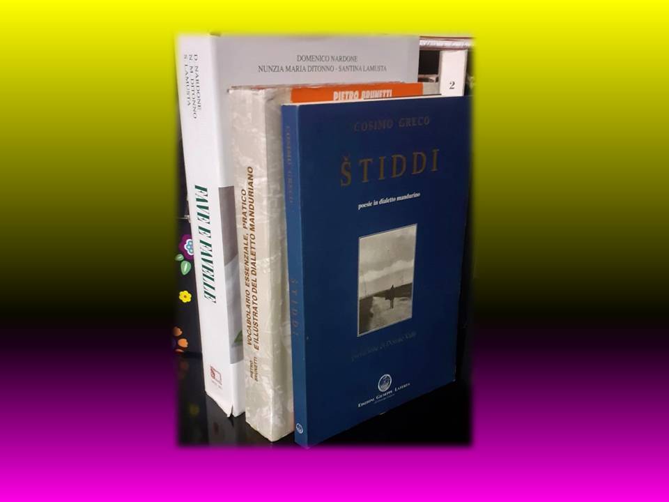 Per approfondimenti, C. Greco, “ ‘Štiddi’ – poesie in dialetto mandurino”; D. Nardone, N. M. Ditonno, S. Lamusta, ‘Fave e favelle’; P. Brunetti, ‘Vocabolario essenziale, pratico e illustrato del dialetto manduriano’. Tutti i testi menzionati sono presenti in biblioteca.