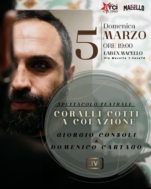 Giorgio Consoli è un attore, musicista, autore, acting coach e performer professionista di origini pugliesi. Nato a Taranto nel 1980, alterna la sua attività di attore e formatore professionista a quella di musicista con il gruppo musicale Leitmotiv (@leitmotivbanda), di cui è cofondatore, attivo dal 2001. La sua esperienza in teatro lo porta a collaborare con molti maestri della scena italiana ed Internazionale quali Luca Ronconi, Lev Dodin, Anatolj Vassiliev, Federico Tiezzi, Romeo Castellucci, Milo Rau in diverse produzioni sceniche. Ha altresì diverse esperienze in campo cinematografico e televisivo ed è stato negli anni diretto da professionisti quali Guido Chiesa, Marcus Stokes, Nico Cirasola , Gianni Lepre, Andrea Porporati, Alessandro Pondi, Milo Rau, Adelmo Togliani, Alessandro Zizzo, e nel 2017 Ha ricevuto nel 2017 il premio Roma Europa Film Awards Festival come Best Actor. Oltre ai Leitmotiv, è voce nel progetto musicale NINOTCHKA dell’amico e polistrumentista Mimmo Pesare. “Coralli cotti a colazione” è il suo primo progetto a firma Giorgio Consoli, con la preziosa collaborazione di Domenico Cartago, Simone Solidoro e Francesco Gaudio per DIGA RECORDS.