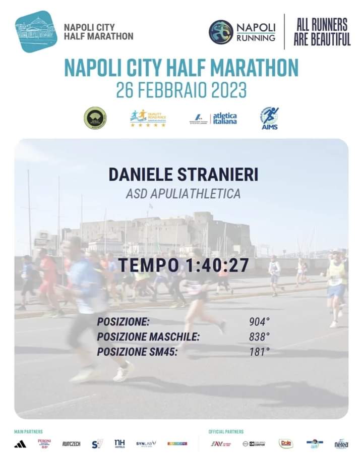 Un altro atleta manduriano, sempre tesserato con l’Apuliathletica, si è cimentato nei giorni scorsi nella Napoli City Half Marathon. Si tratta della mezza maratona, ovvero di un percorso di 21 km e 37 metri.