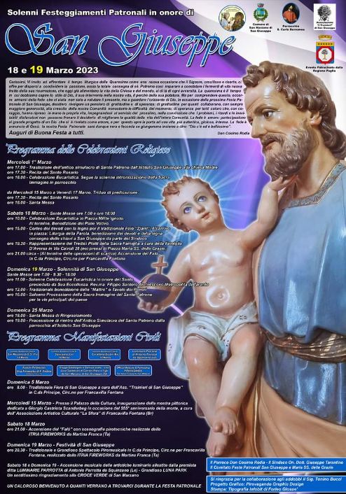 Stanno per entrare nel vivo i festeggiamenti patronali in onore di San Giuseppe. Con questo articolo vi proponiamo il messaggio di don Cosimo Rodia e il programma dei festeggiamenti religiosi e di quelli civili.