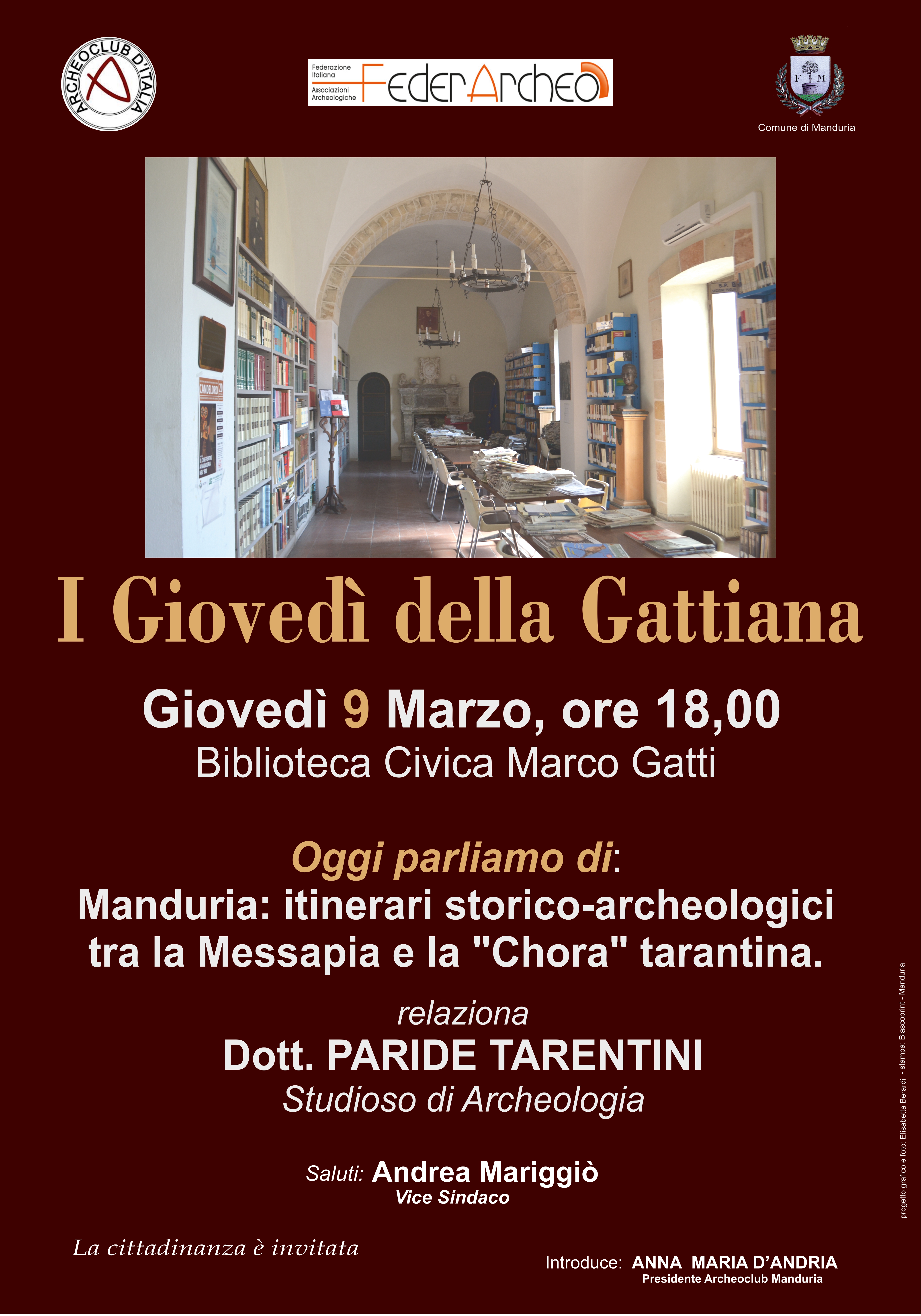 Si parlerà di Manduria messapica giovedì 9 marzo, alle ore 18, nella biblioteca civica “Marco Gatti” per “I Giovedì della Gattiana”.