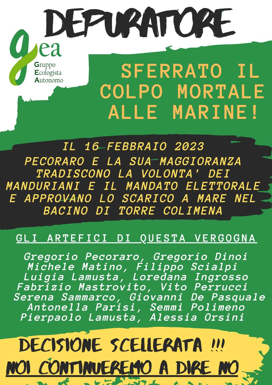 Sulle ultime vicende burocratiche del depuratore consortile, il gruppo consiliare GEA prende nuovamente posizione. Questa volta lo fa attraverso un manifesto, fatto affiggere sui muri di Avetrana e che dovrebbe essere affisso, nei prossimi giorni, anche sui muri delle marine e di Manduria.