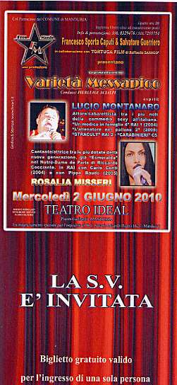 Messapico, uno spettacolo che, promosso da Francesco Sporta Caputi e da Salvatore Guerriero (in collaborazione con “Tortuga Film” di Raffaello Saragò), si terrà mercoledì 2 giugno, presso il teatro Ideal.
