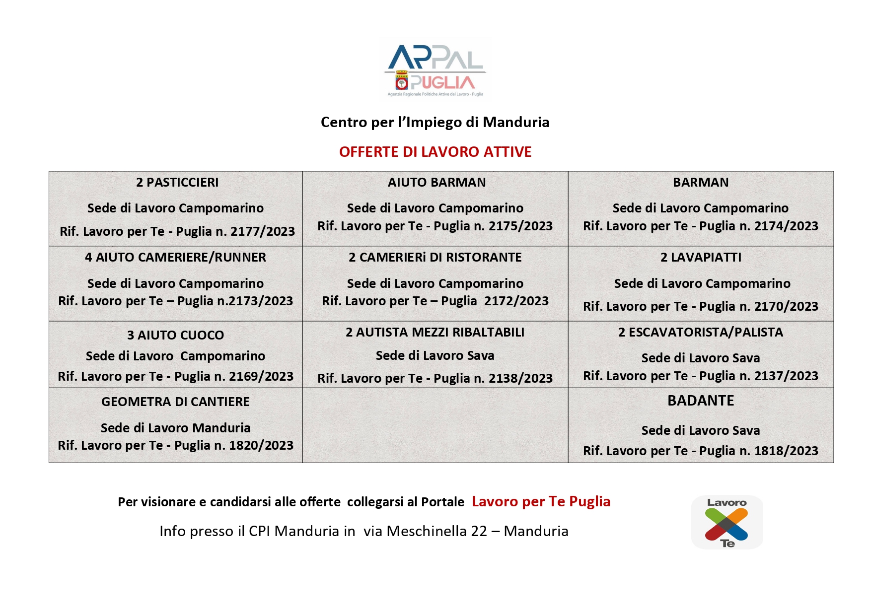 Si cercano pasticcieri, barman, aiuto-barman, camerieri, lavapiatti, aiuto cuoco, autisti, escavatoristi, geometri e badantia Campomarino, Sava e Manduria.