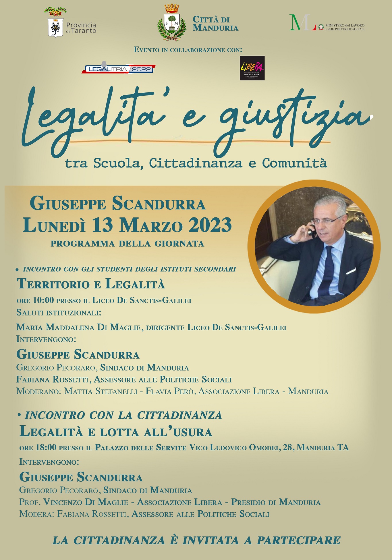 Lunedì 13 marzo sarà a Manduria Giuseppe Scandurra, presidente della Federazione Nazionale delle Associazioni Antiracket e Antiusura. Si tratta del quinto appuntamento della rassegna “Legalità e giustizia tra scuola, cittadinanza e comunità”, una rassegna educativa sulla legalità e sulla giustizia, voluta dall’Amministrazione comunale in collaborazione con Legalitria e Libera Manduria, che ha l'obiettivo di sensibilizzare i giovani studenti e tutti i cittadini sui tema della legalità e della Giustizia come fattori essenziali per la costruzione di una comunità che sappia muoversi nel solco del rispetto, della convivenza, dell'impegno civico e di un'etica che unisca i popoli.