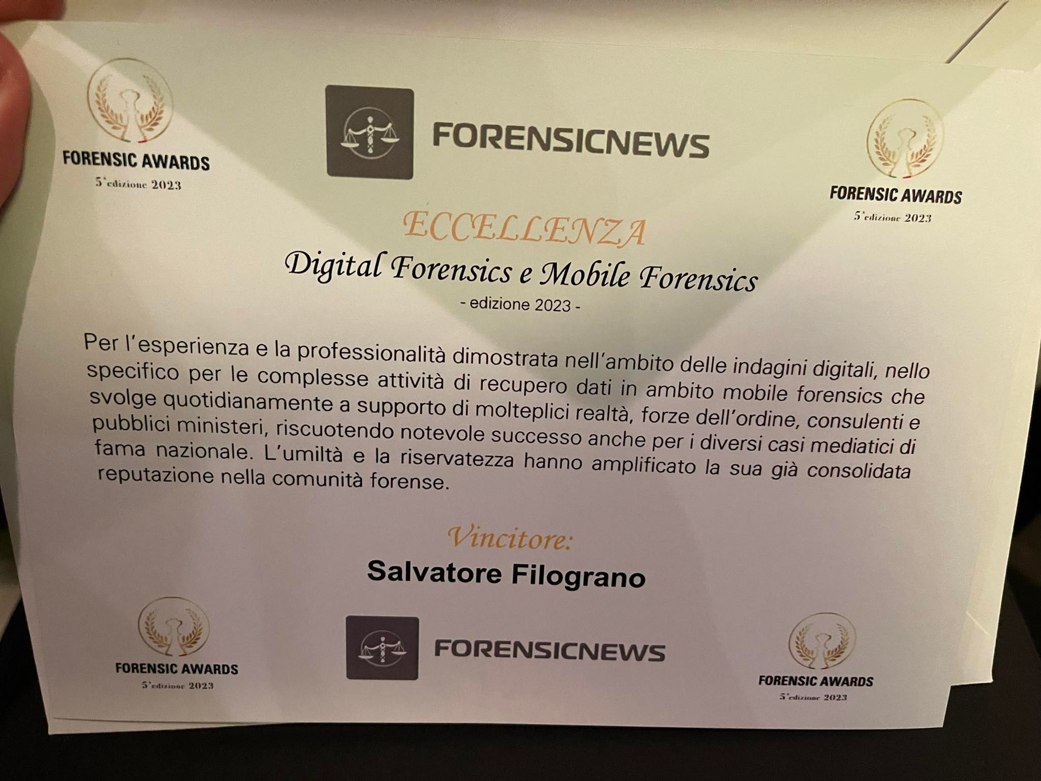 Per la quinta edizione del “Forensic Awards” i finalisti per la sezione Digital Forensics e Mobile Forensics erano quattro: Nicola Chemello, Michele Ferrazzano, Silverio Greco e, appunto, Salvatore Filograno.