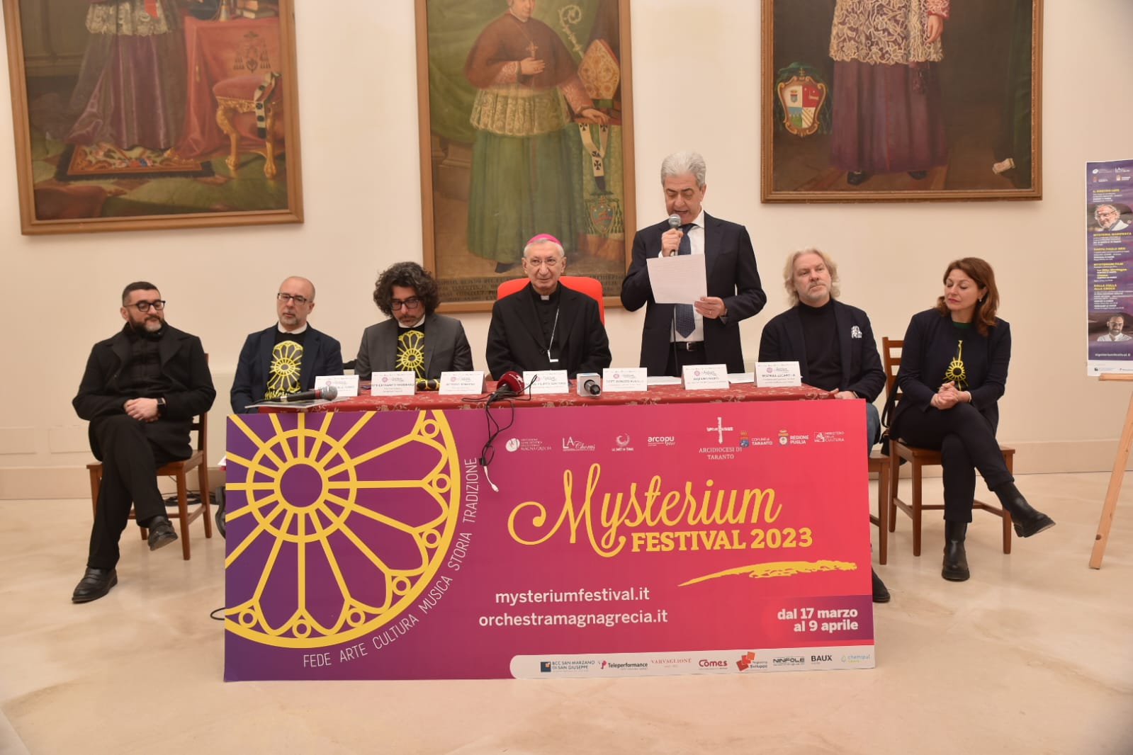 Hanno partecipato alla Conferenza stampa l’Arcivescovo metropolita di Taranto, monsignor Filippo Santoro; il portavoce dell’arcivescovo, don Emanuele Ferro; i direttori artistici del Mysterium Festival, il Maestro Piero Romano, direttore artistico dell’Orchestra Magna Grecia, e il Maestro Pierfranco Semeraro, presidente ARCoPU; l’assessore a Cultura e Spettacolo, Fabiano Marti; il presidente del Comitato scientifico, Donato Fusillo; Beatrice Lucarella, presidente della Sezione Industrie alimentari e Turismo di Confindustra. Presenti all’incontro, fra gli altri, il presidente de Le Corti di Taras, organizzatrice del Mysterium Festival, Nunziata Aresta; il presidente dell’Associazione musicale Luis Bacalov, Giovanni Ammirati; il presidente CRAC Puglia, Giulio De Mitri.