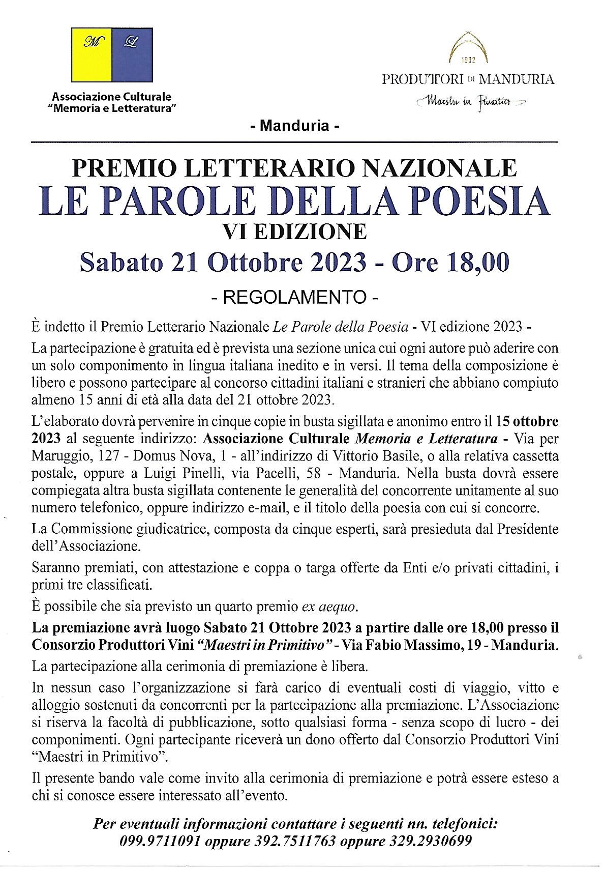 Ecco il regolamento dell’evento promosso dall’associazione culturale “Memoria e Letteratura” e dai Produttori di Manduria
