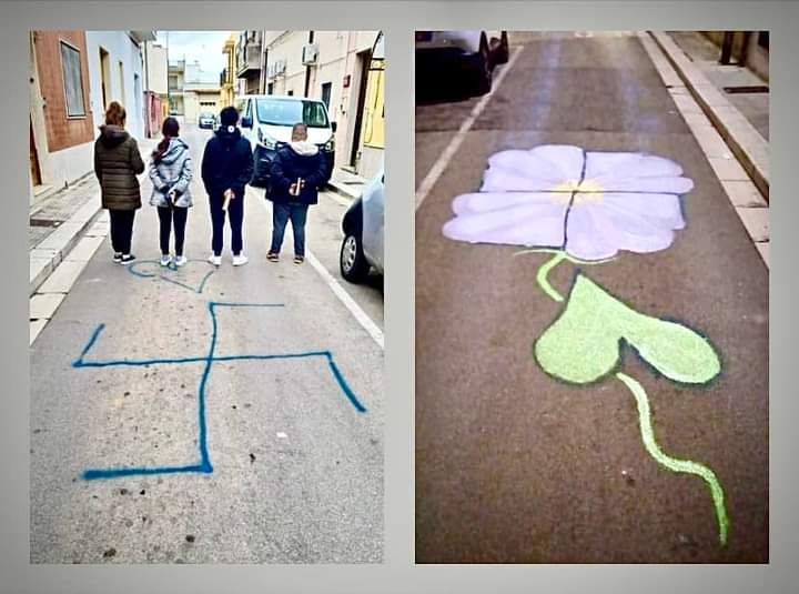 «Mesagne, un imbecille disegna un simbolo dell’orrore» racconta il sindaco Toni Matarrelli. «I bambini della cooperativa Divenire lo trasformano, con un colpo di fantasia, in un simbolo di vita. Bravissimi!