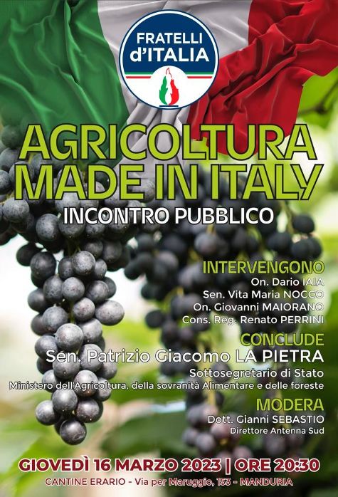 Alla presenza del Sottosegretario di Stato per l'agricoltura, la sovranità alimentare e le foreste, Giacomo La Pietra, vi sarà un confronto sulle tematiche che riguardano la tutela e la valorizzazione dei prodotti agricoli italiani, con un focus particolare sulle tipicità del nostro territorio.