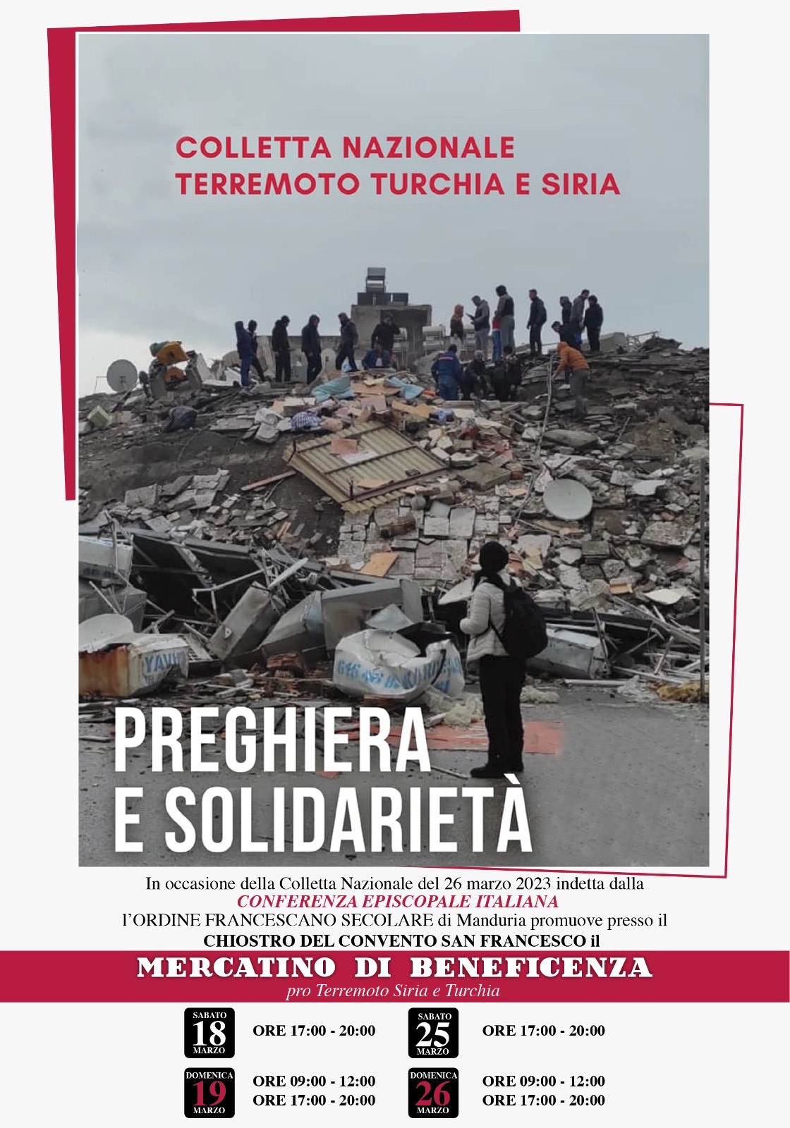 Per questa occasione la Fraternità dell’Ordine Francescano Secolare (OFS) con i Frati minori, promuove un MERCATINO DI BENEFICENZA pro terremoto che si svolgerà nel chiostro del convento di San Francesco in Manduria nei seguenti giorni: