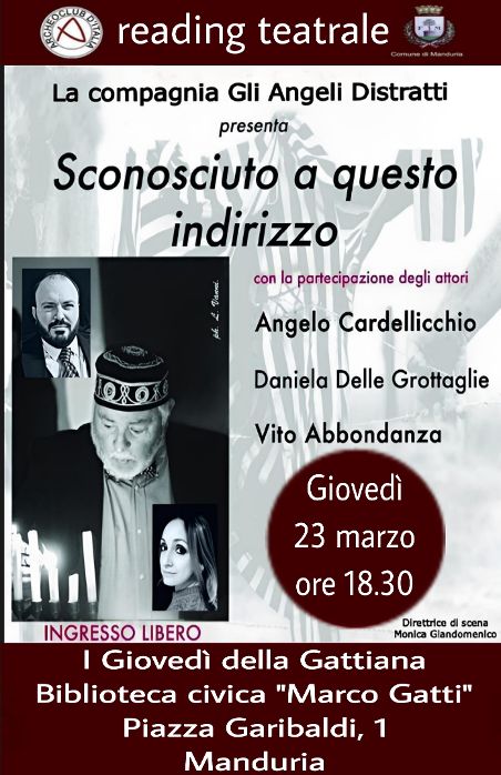 Giovedì 23 marzo la compagnia teatrale “Gli Angeli Distratti”, nell’ambito degli incontri culturali “I Giovedì della Gattiana”, alle ore 18,30, nella sala di lettura della biblioteca civica presenterà “Sconosciuto a questo indirizzo”, un intenso e coinvolgente reading teatrale tratto dal libro dell’autrice americana Kressmann Taylor dallo stesso titolo.