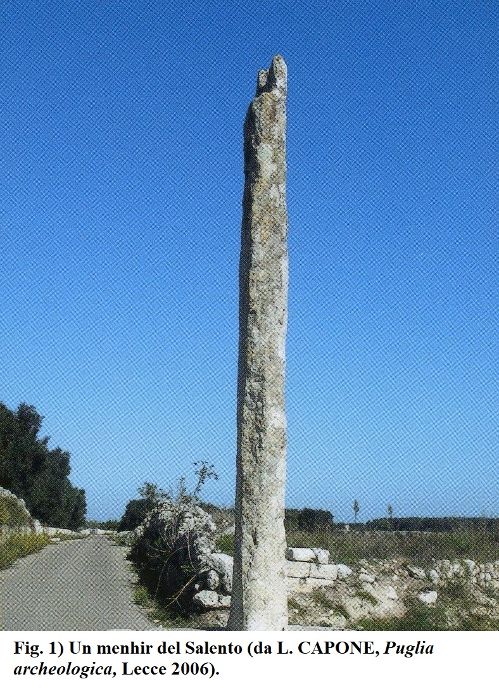 Alti e slanciati monoliti in pietra, ne costituiscono gli esemplari più antichi, forse derivati, in queste forme primordiali, da pietrefitte antichissime, i cosiddetti menhir ( dal bretone men = pietra hir = lunga ) elevati dai nostri progenitori in ossequio alle loro credenze pagane, tra l’ Eneolitico ed il principio dell’età del Bronzo (III-II millennio a.C.) (vedi N. LETIZIA, Le colonne votive nella provincia di Lecce (Parte prima), in “lu Lampiune”, IX (1993), 3, pp. 71-74) (fig. 1).