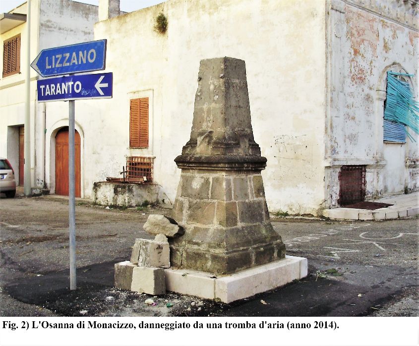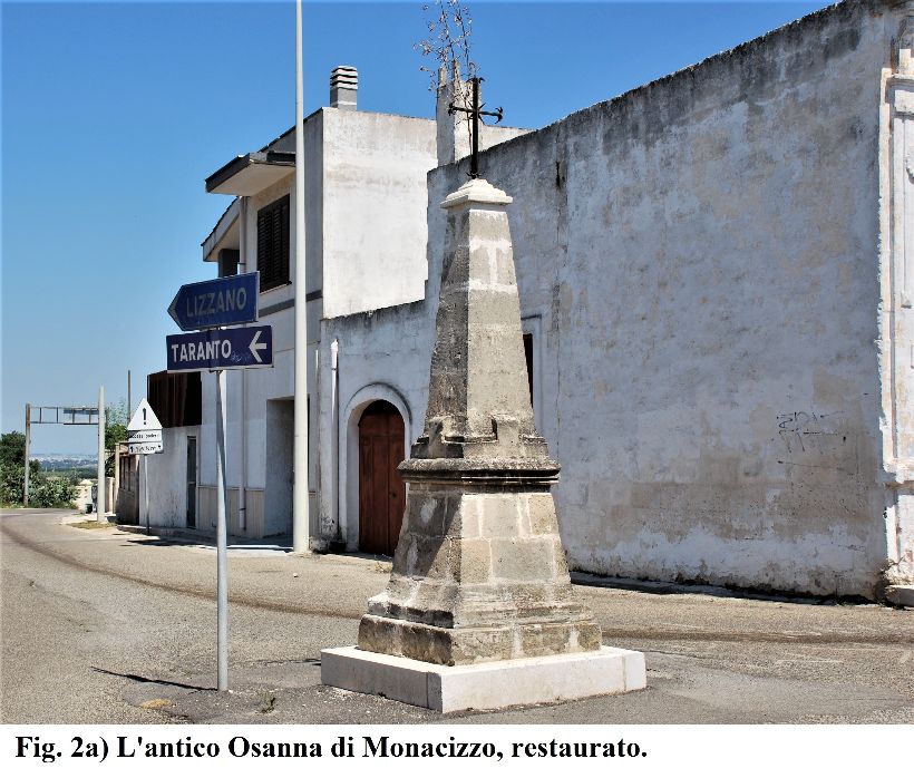 All’interno dei nostri territori ad oriente di Taranto, un grande Osanna sormontato da capitello con croce e ramo d’olivo benedetto è presente alla base della collinetta di Monacizzo (frazione del comune di Torricella), alla confluenza di arterie provenienti da Lizzano, da Pulsano e dal mare. Realizzato in tufi, presenta forma troncopiramidale, con pedana di base. Nei pressi si colloca la chiesetta della Madonna di Loreto, ricca di credenze e leggende popolari, incentrate, queste ultime, su interventi prodigiosi operati della Vergine durante il Medioevo, a salvaguardia del paese da Turchi e pirati; luogo di fede e tradizione, quindi, vivificato da belle immagini pasquali offerte, come in vecchi fotogrammi in bianco e nero, da famiglie contadine di ritorno dalla Santa Messa con, tra le mani, lunghi ramoscelli d’olivo benedetto da collocare nelle case e nei campi, a protezione, cioè, dei quotidiani luoghi di “vita” e “fatica” (P. TARENTINI, Monacizzo. Un antico centro magnogreco e medievale a sud-est di Taranto, Manduria, Regione Puglia - C.R.S.E.C. TA/55, 2006) (figg. 2-2a).